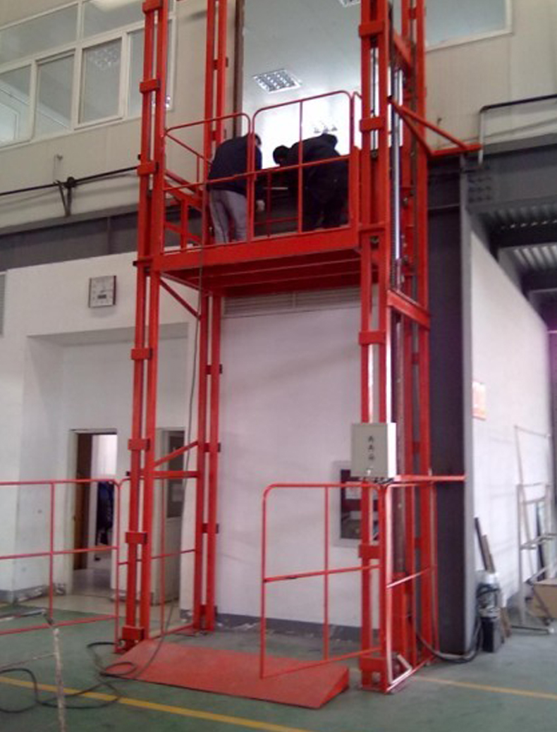 客戶(hù)選中的是醒目的桔紅色,額定載荷為1噸,臺面尺寸0.9*0.8米,凈升高度為3米。臺面上做了兩側護欄,進(jìn)出貨口兩側各做一套護欄門(mén)。