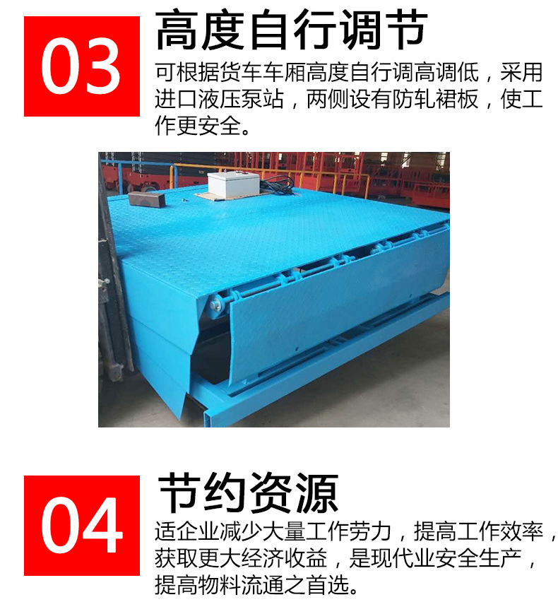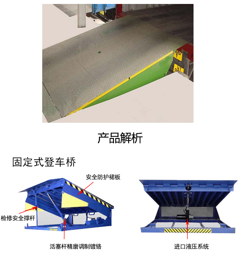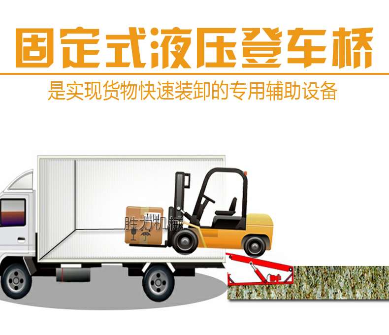 固定式登車(chē)橋是一種安裝在庫房月臺上的裝卸輔助設備,它不工作時(shí)與月臺地面平齊,裝卸作業(yè)時(shí)可根據貨車(chē)車(chē)廂的高度進(jìn)行調節登車(chē)橋的高度,使貨車(chē)與倉儲的貨臺之間架起一座橋梁,叉車(chē)等搬運車(chē)輛通過(guò)它能直接駛入貨車(chē)內部進(jìn)行貨物的批量裝卸作業(yè),僅需單人作業(yè),即可實(shí)現貨物的快速裝卸。固定式登車(chē)橋使企業(yè)減少大量勞力,提高工作效率,獲取更大經(jīng)濟效益。